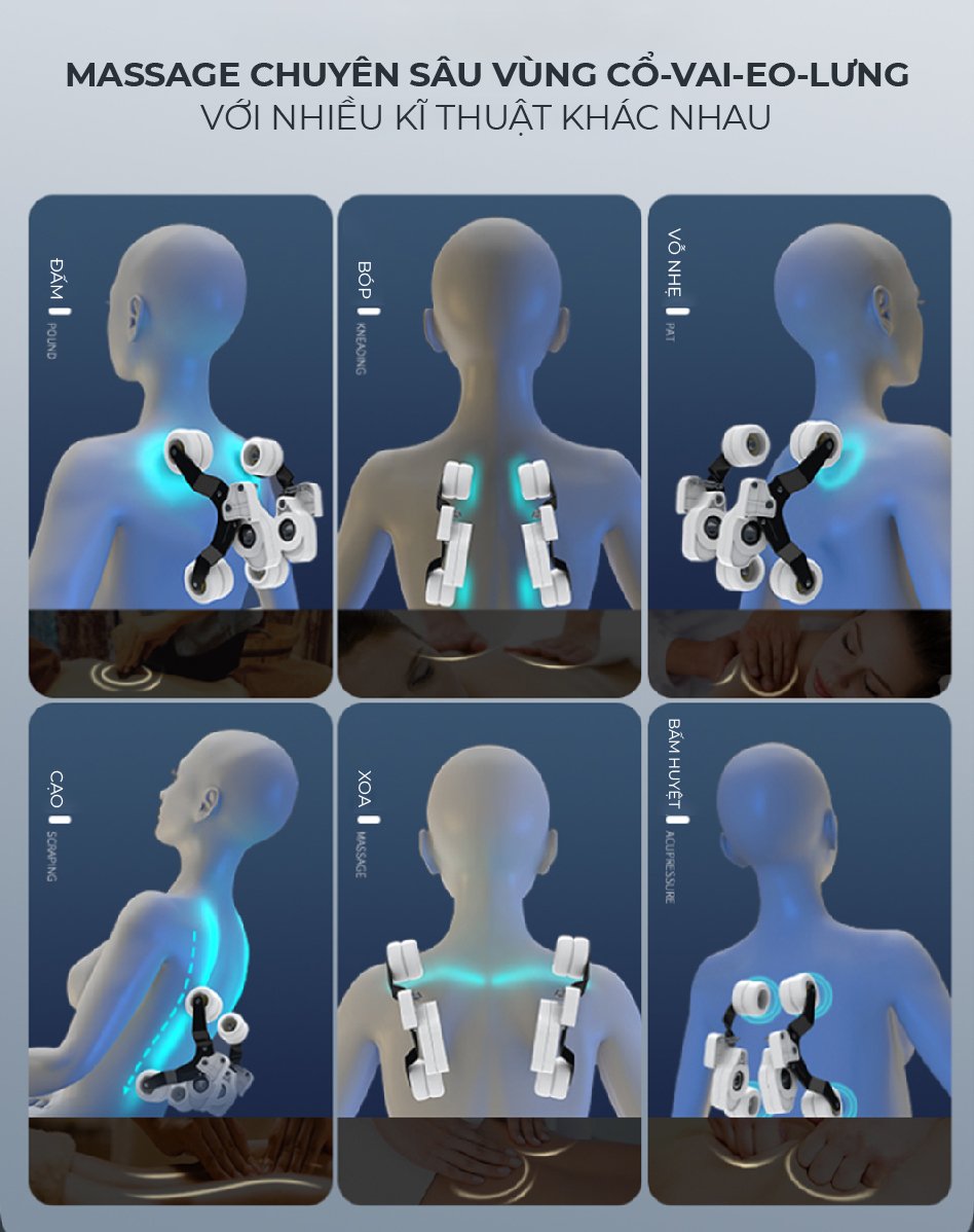 | Động tác massage | Nhào, miết, vỗ, đấm, xoa bóp, kéo duỗi |
