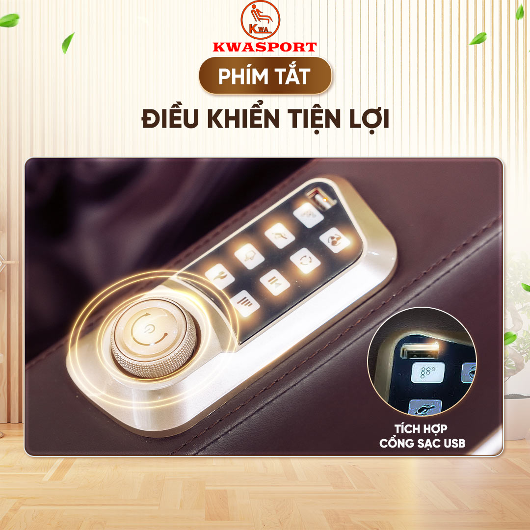Phím tắt nhanh đặt bên tay ghế cho phép điều chỉnh nhanh một số chức năng cơ bản. Tích hợp cổng USB giúp sạc điện thoại hoặc thiết bị trong khi thư giãn.