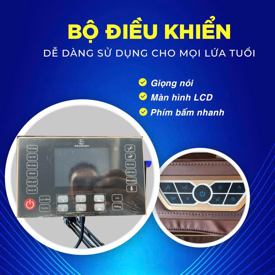 Với COMBO điều khiển gồm: Màn hình cảm ứng LCD sắc nét, hệ thống phím bấm nhanh tiện lợi hoàn toàn bằng cảm ứng và điều khiển bằng giọng nói siêu nhạy bén. Tất cả những gì bạn cần làm là thư giãn trên ghế, thao tác vài nút chạm đơn giản, hoặc bạn chỉ cần đọc các câu lệnh được thiết lập sẵn và ghế massage sẽ ngay lập tức đáp ứng yêu cầu của bạn. Hoàn toàn nhanh chóng và dễ dàng sử dụng.